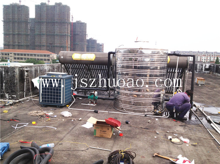 工程介紹:工程使用了一臺5匹商用主機,一臺3噸不銹鋼保溫水箱,提供員工淋浴洗澡用熱水。